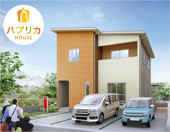 お子さん2人以上のファミリー世帯に人気の32坪・4SLDKの新築プラン。玄関から直接アクセスできる和室があり、ファミリーウォークインクローゼットも完備の二階建て住宅。