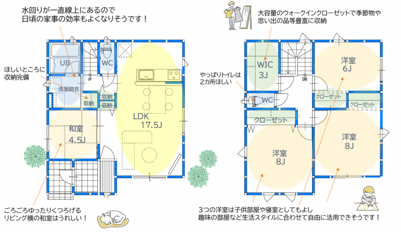 | 設備 | 温水洗浄便座、トイレ2ヶ所、追焚機能、システムキッチン、カウンターキッチン、IHクッキングヒーター、浄水器、食器洗浄乾燥機、ウォークインクローゼット、床下収納、洗髪洗面化粧台、照明器具、電気、上水道、下水道、側溝、複層ガラス、モニタ付インターホン、庭、駐車場2台分、駐車場3台分 | ||